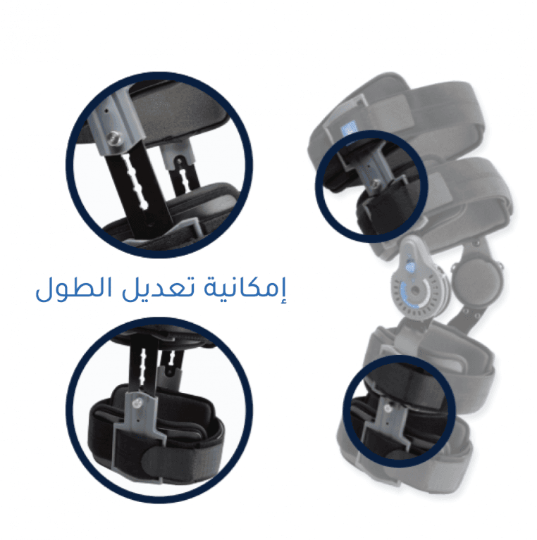 تتميز دعامة الركبة بمفصلات ROM مع قفل قابل للإسقاط، وإعدادات قابلة للتعديل للثني والتمديد دون الحاجة لأدوات إضافية، مما يجعل تعديلها سهلًا ومريحًا ويضمن تجربة استخدام سلسلة.